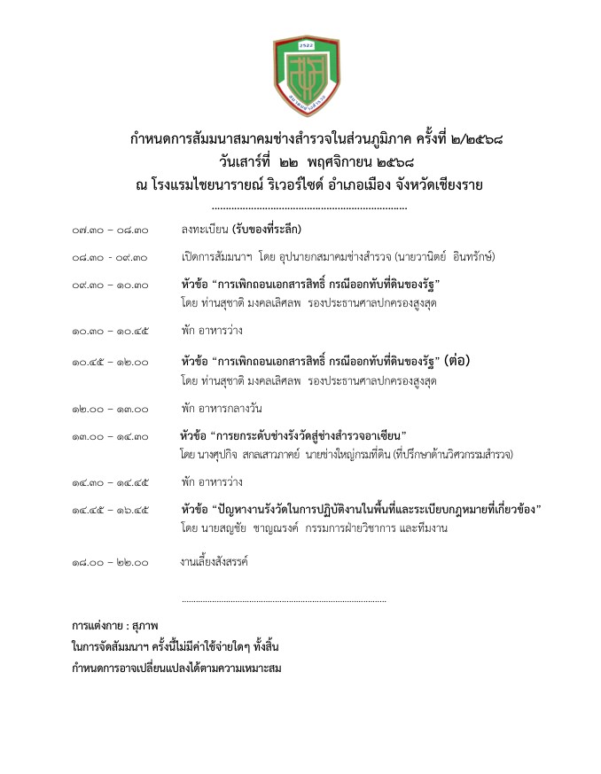 กำหนดการสัมมนาสมาคมช่างสำรวจในส่วนภูมิภาค ครั้งที่ 1/2568